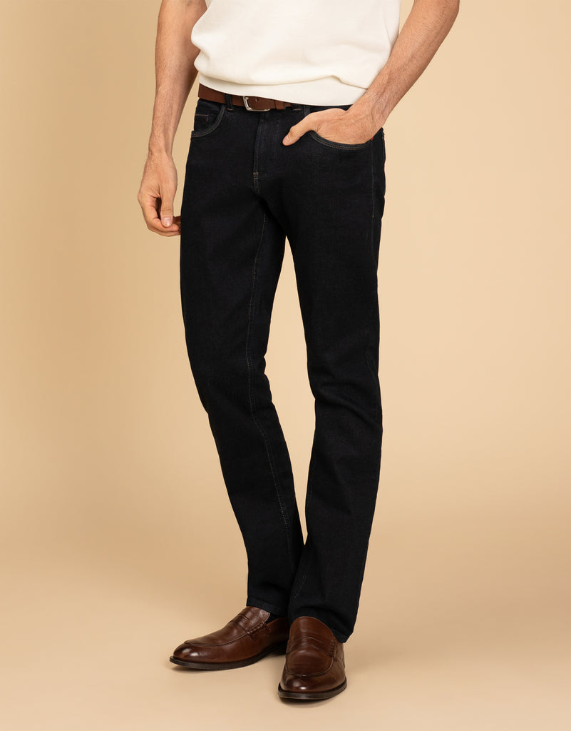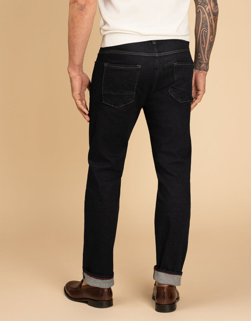 The Austin Jean in Dark Indigo Rinse is where structure meets subtlety. Designed with a relaxed taper through the leg, this fit offers generous room in the thigh before tapering cleanly from the knee down—delivering everyday comfort with a refined silhouette. Crafted from 9.5 oz stretch denim the fabric balances softness, durability, and year-round wearability.
