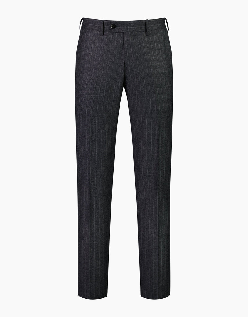 Our latest Cooper suit include an updated trouser with an improved fit. Cut in a Reda Super 130's cloth, this charcoal stripe fabric makes a strong sartorial statement.