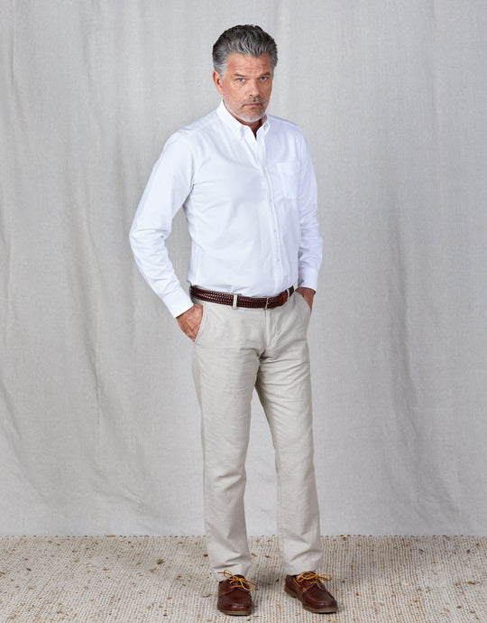 Indulge in both comfort and style with these straight-leg trousers. Made from a luxurious and lightweight blend of cotton and linen, these trousers boast a compact weave for a crisp silhouette and a subtle check print in beige. Create a polished uniformed look with a matching Split jacket or make a bold statement by pairing them with a contrasting color.