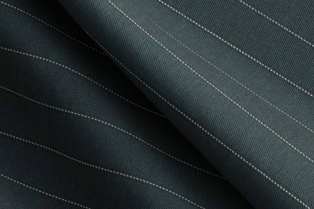 This bottle green/white pin dot fancy stripe made to measure suit, is tailored using a 100% wool luxury suiting from the Holland & Sherry Intercity range. Specifically woven to give the fabric body and fullness, which provides both durability and good drape.